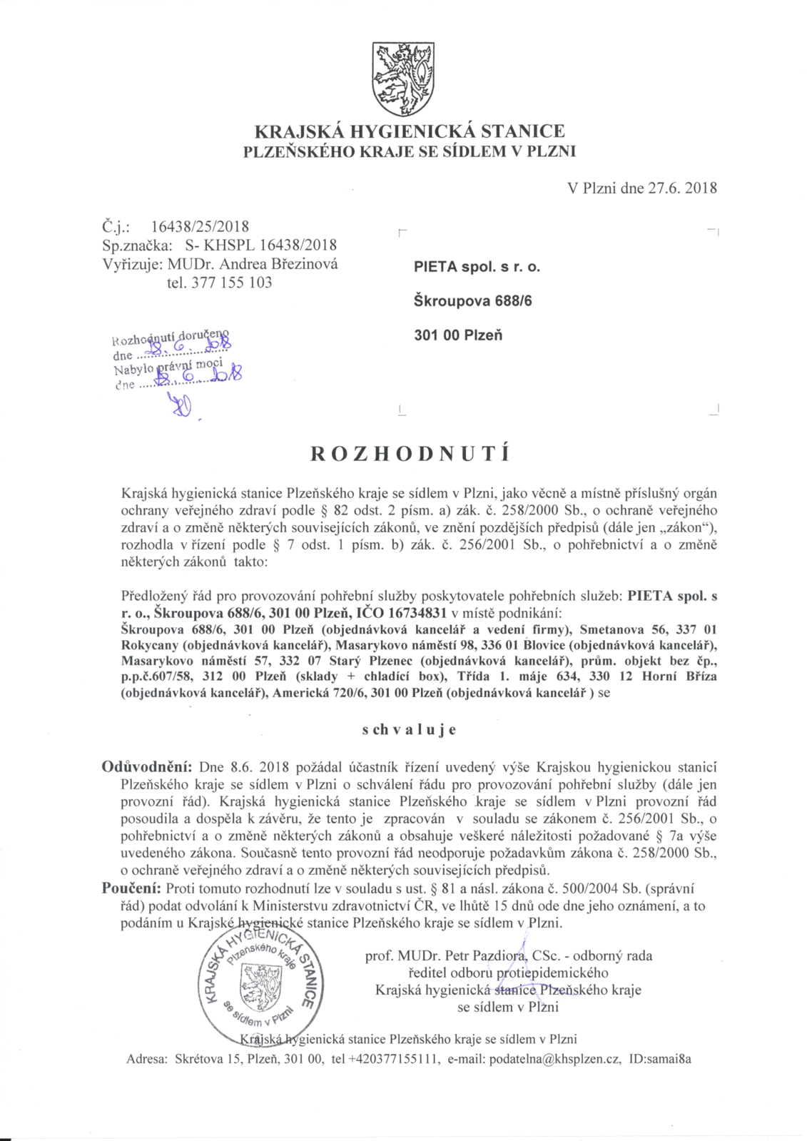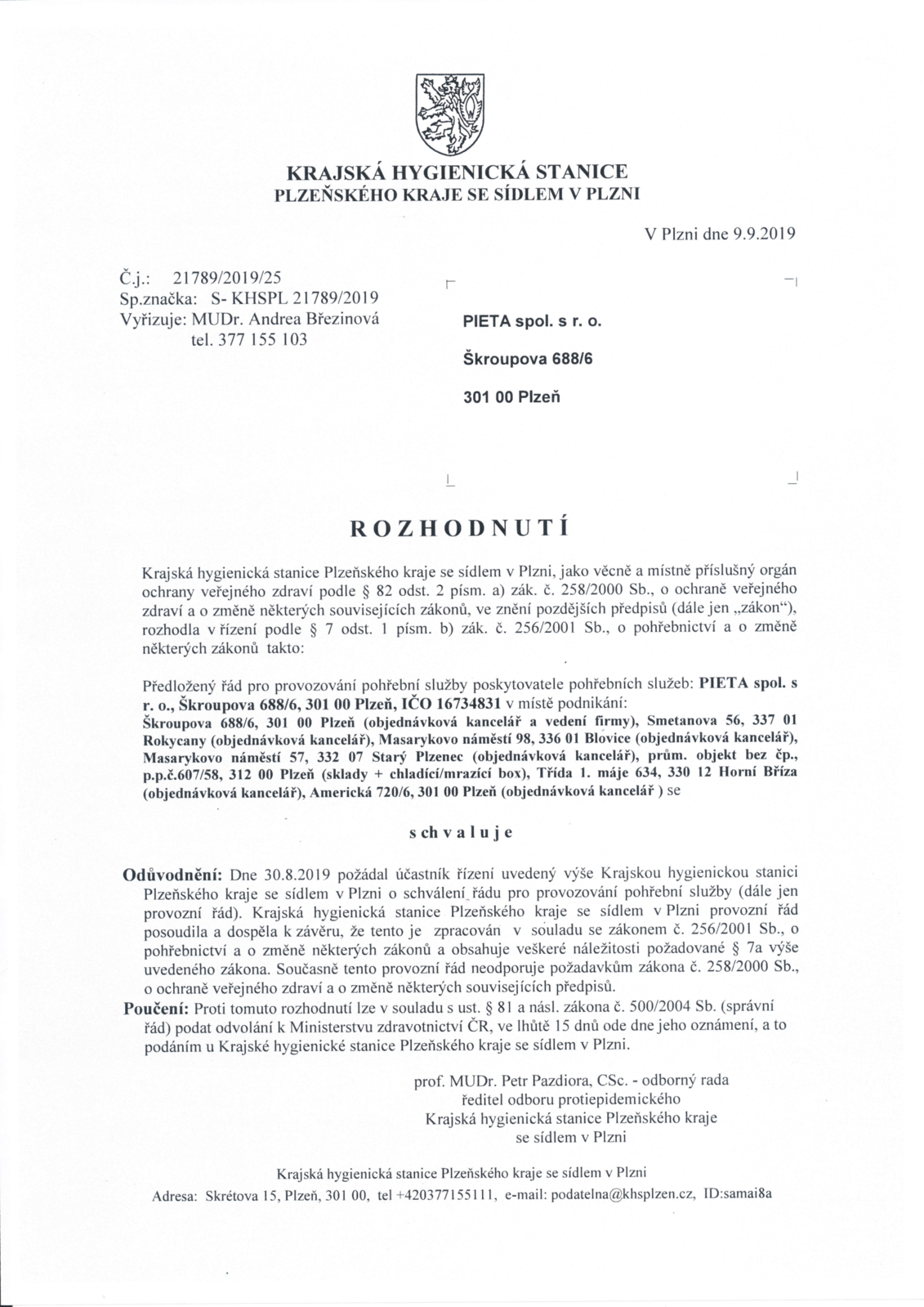 Ředitelka společnosti Milena Kunová je zmocněncem Sdružení pohřebnictví v ČR pro Západní Čechy.